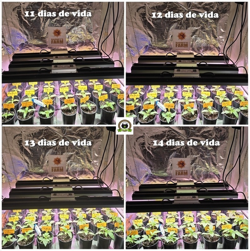 11, 12, 13 y 14 dias de vida: En esta fotografía de abajo vemos la evolución perfectamente secuenciada de 3 dias, 72 horas. He mirado el tiempo que tengo estas barras led y os puedo decir que llevan trabajando cerca de 5.000 horas y según el fabricante son 50.000 horas de uso, las tendre que dejar en herencia ya que aún les queda cuerda para rato. Para una correcta deshidratación de la plántula es obligado un ventilador giratorio que las haga «bailar».
