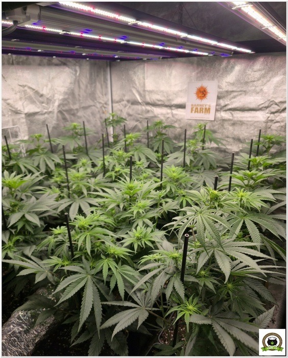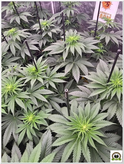 Dia 12 de floración: La bandeja de cultivo es negra y no se ve nada, todo es un manto verde. Aunque nadie lo ha preguntado, el trasplantar la maceta de 1 litro en los bordes de las de 11 litros, es para que ocurra esto. las plantas de los laterales tienen la planta en los bordes y el tutor hacia adentro para asi ayudar a colonizar más facilmente toda la siperficie del armario. Este armario tiene una superficie de 2,1 m2 que son ocupados en su totalidad: