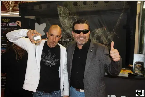 - No disponía de mucho tiempo para hacer este reportaje y las visitas tenían que ser breves, no podía estar todo el tiempo que yo quería y tenía que ir un poco a la carrera. Fui al stand de GreenHouse Seeds para buscar a mi amigo Franco, famoso por ser uno de los «Strain Hunters» ya que quería que viera una cosa. Eran unos cogollos de una de sus variedades de marihuana, la «Kalashnicova», una variedad cannábica que me hizo ganar mi primer concurso a nivel mundial. Esta planta la coseché el 15/2/2012, sí, en el momento de dársela a Franco estos cogollos tenía 3 años, 1 mes y 5 días de curación. Franco no se lo creía. Mi amigo Nvidia, también de GreenHouse Seeds no estaba y tuve que pasar hasta tres veces por el stand para localizarlo y poder estar charlar un rato hablando con él.